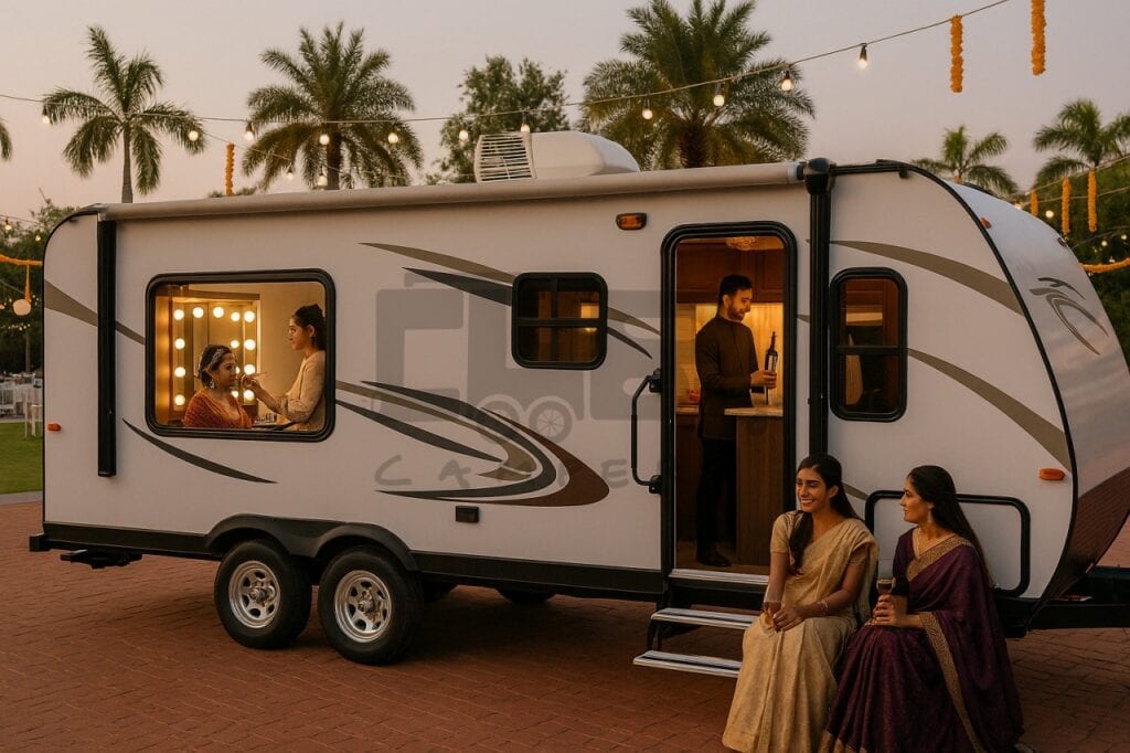 With our Forest River-built, India-adapted travel trailers, you can now offer mobile bridal suites, cocktail lounges, makeup stations, or even private content rooms – parked directly on your lawn, by the pool, or beside the mandap. These aren’t caravans for travel, they’re curated spaces for celebration, styled to elevate the wedding experience without disturbing your architecture, schedule, or operations.